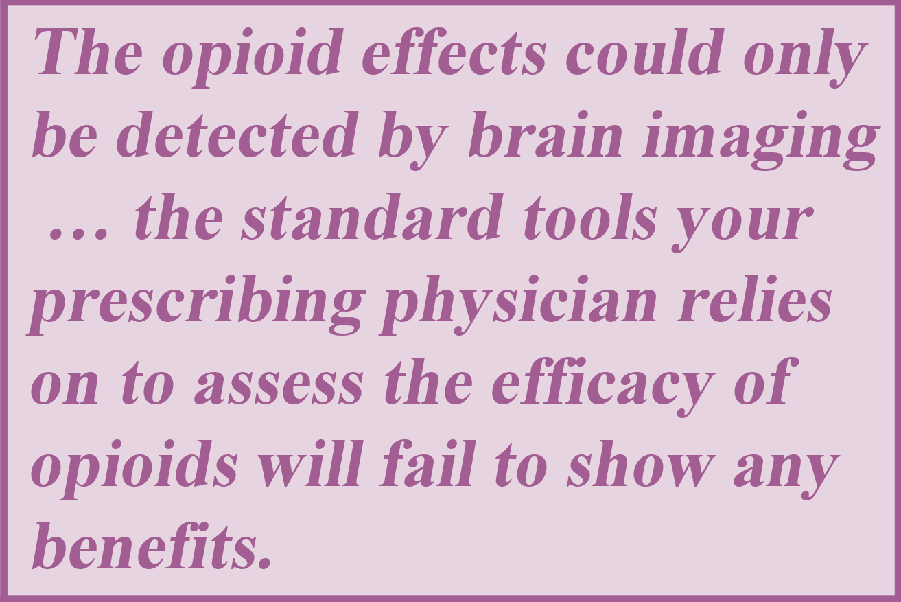 If you are wondering whether the pain levels, psychological measures or other clinical symptoms were different between the two patient groups, the answer is NO. The opioid effects could only be detected by brain imaging. In other words, the standard tools your prescribing physician relies on to assess the efficacy of opioids will fail to show any benefits.